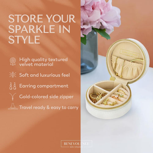 Keep your treasured jewelry safe and organized with our Plush Velvet Round Jewelry Box. Designed for both style and function, this compact yet spacious case features a soft, luxurious velvet exterior and a secure zipper closure. Inside, you'll find six slot rolls, two compartments, and an elastic pocket, providing ample space for rings, earrings, necklaces, and bracelets.